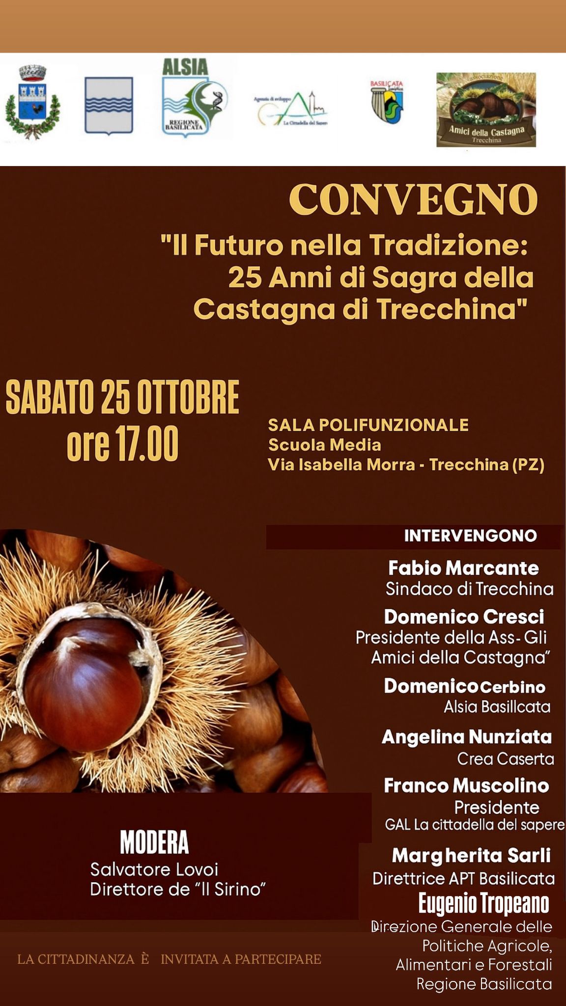 Trecchina (PZ) – In occasione del 25° anniversario della Sagra della Castagna di Trecchina, sabato 25 ottobre si terrà un convegno celebrativo dal titolo “Il Futuro nella Tradizione: 25 Anni di Sagra della Castagna di Trecchina”.